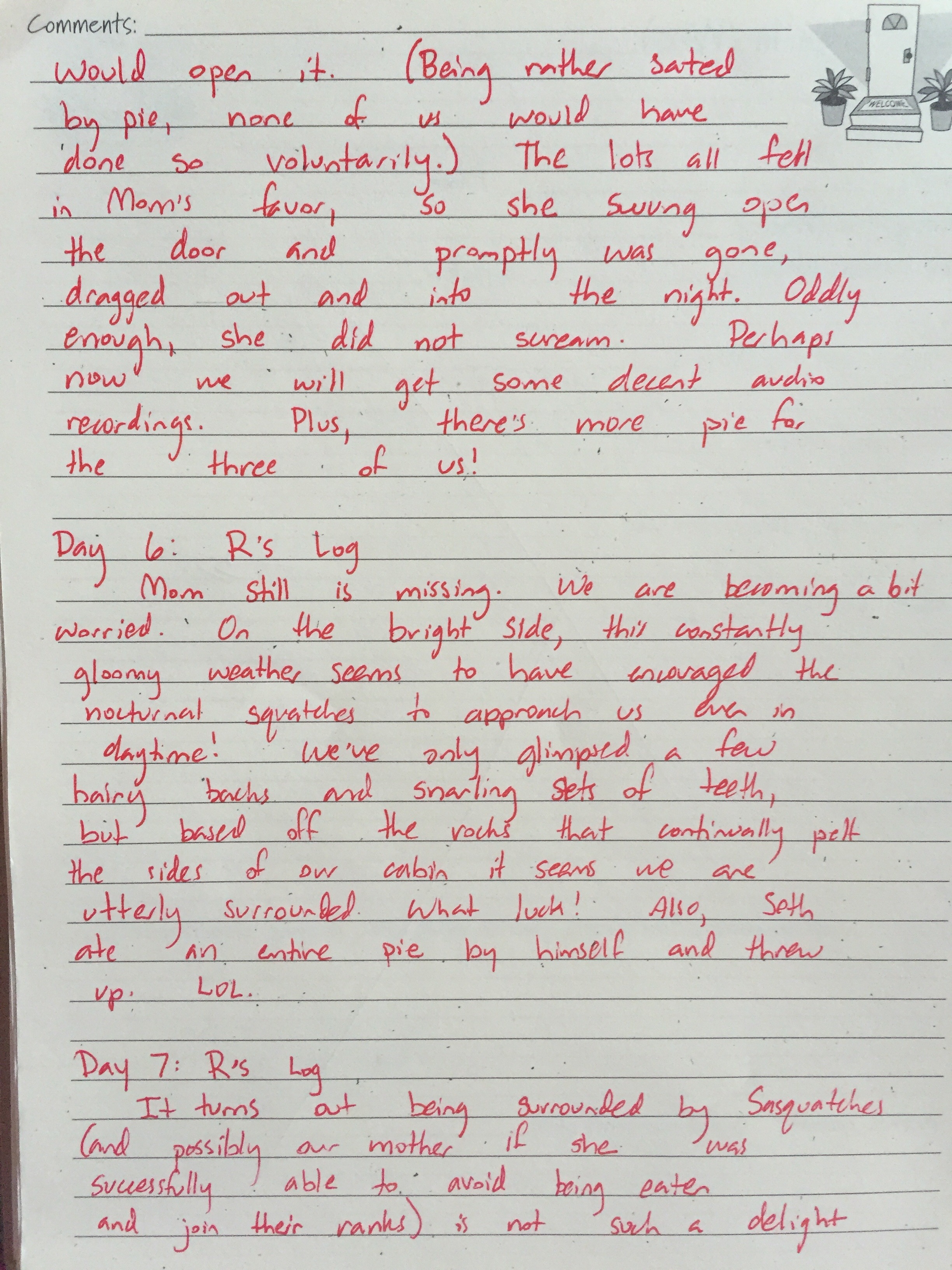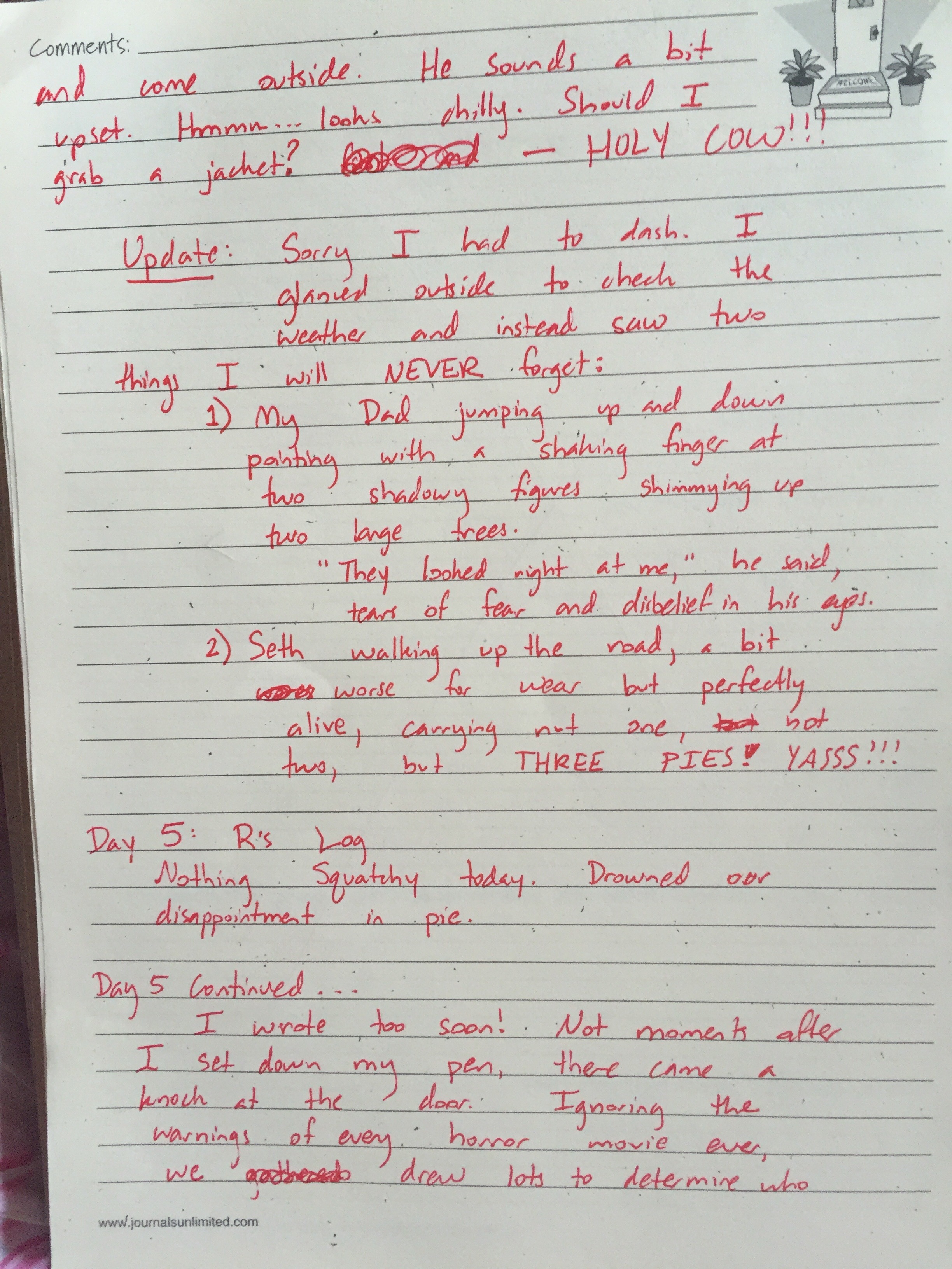 Dull, right?! Well, being a writer and, admittedly, a Bigfoot enthusiast, I had to do something to break up this pattern of lameness… It is with great pride and no small amount of humor that I present to you my vacation log. It is my hope that it will entertain and frighten guests long after I depart this place. 😈