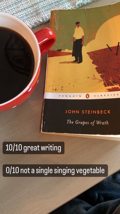 - Something Beautiful: I recently finished reading The Grapes of Wrath. I should have read it long ago, but I am also glad that I have so many great novels left to discover. This book is packed with beautiful writing, but not in a sentimental, polished, comfortable sort of way. Instead, it left me uncomfortable, convicted, and sorrowful. But this can be beautiful too. This book is about resilience, strength, and human dignity in the face of environmental catastrophe and economic injustice. Its words were a gorgeous gut punch. My one complaint is that, unlike the VeggieTales version, there was not a single singing vegetable or musical fruit…