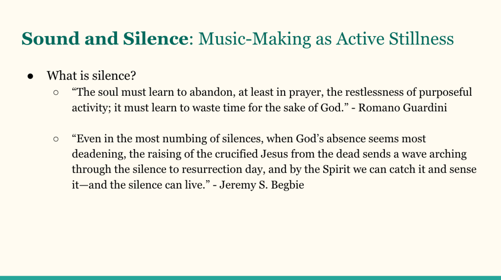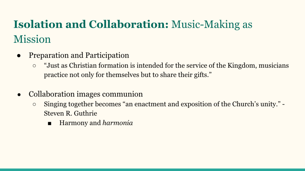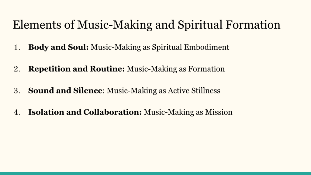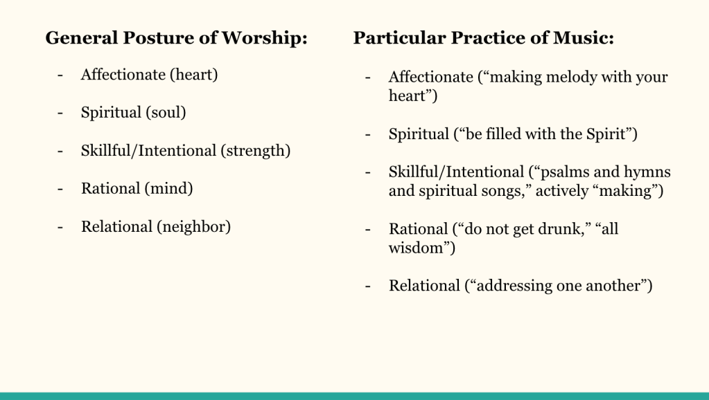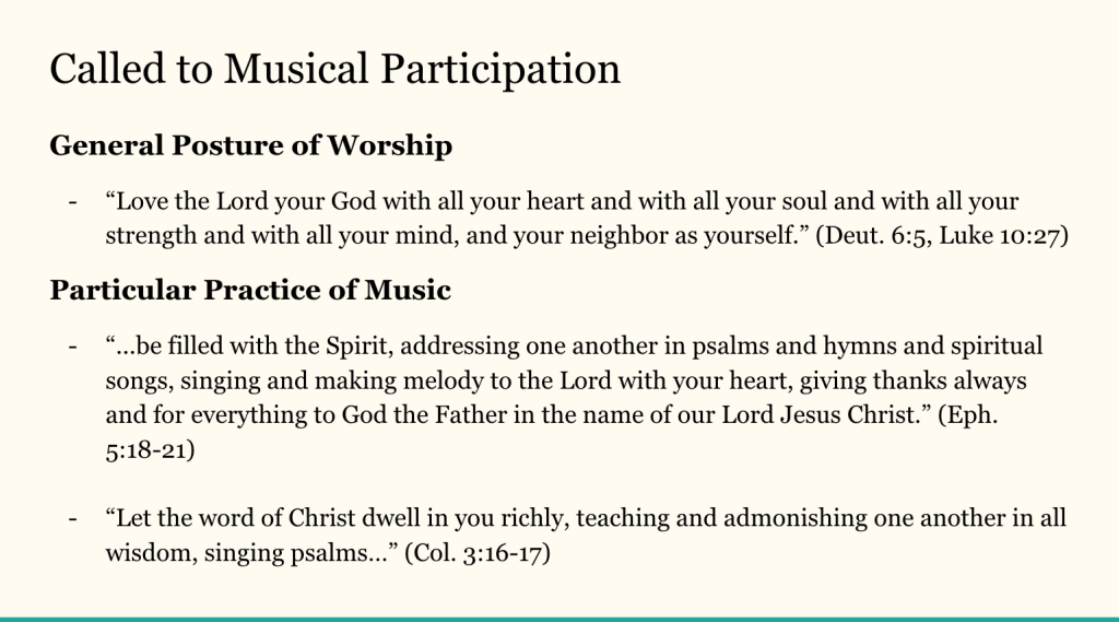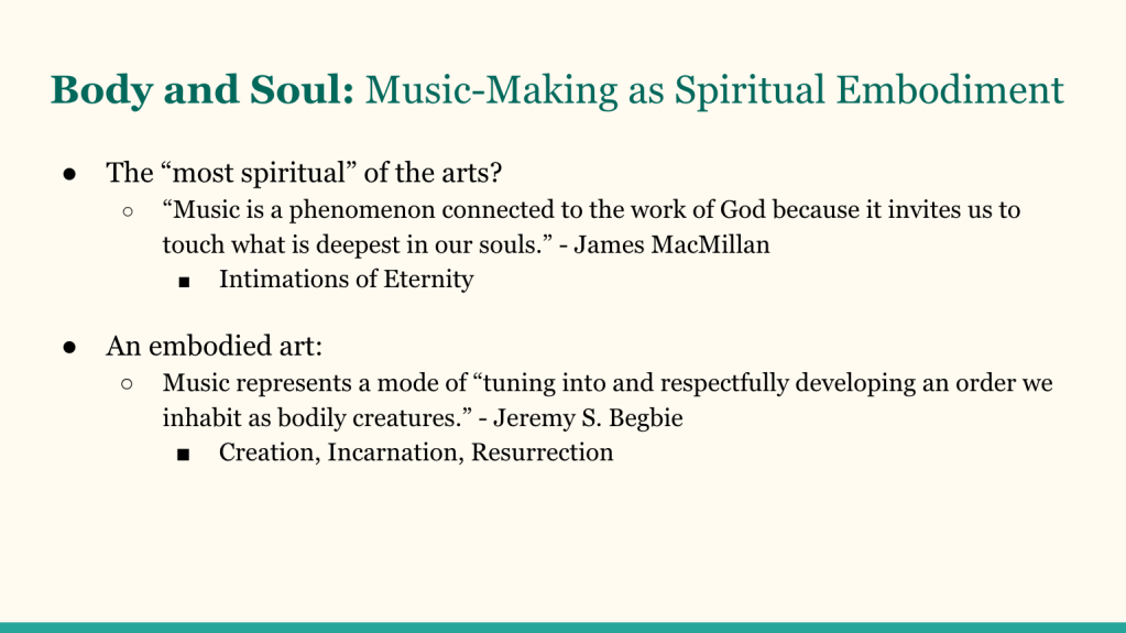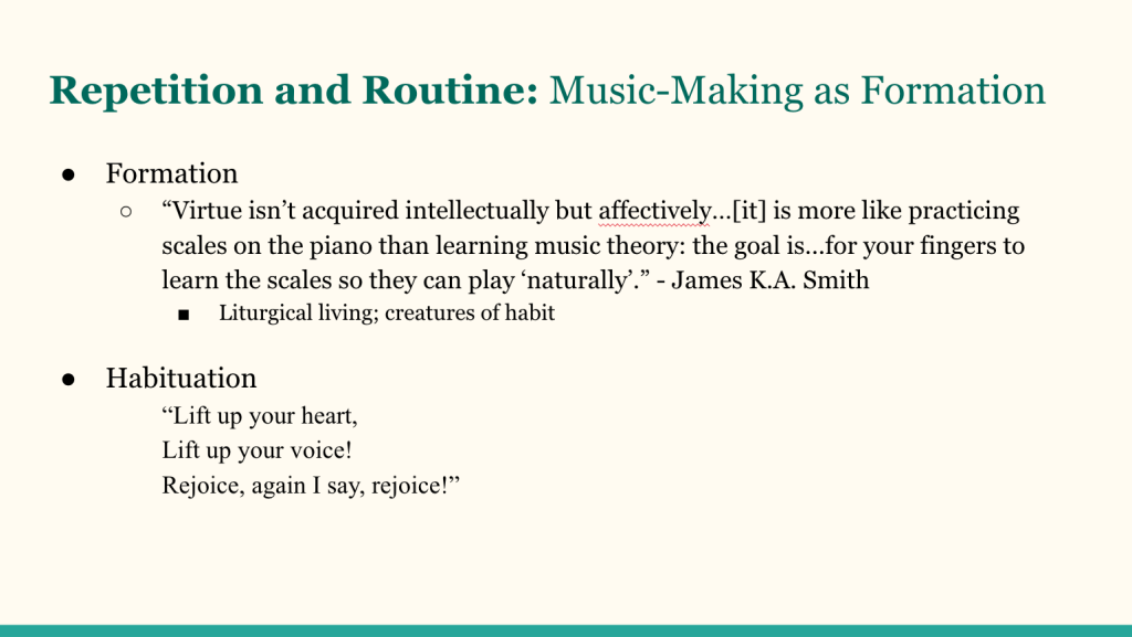 I had the absolute joy of speaking on music-making, spiritual formation, and worship last night at Redemption Church Arcadia. It was such a fruitful time of sharing my thesis on musical practice as spiritual formation and then discussing how this factors into congregational worship. You can watch and listen here (slides included below):
