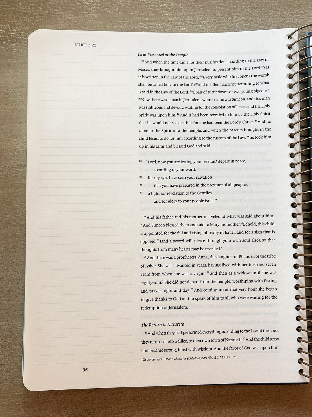 The ESV Spiral-Bound New Testament satisfies even my journaling standards. It’s large enough that I can write freely, and its lined space is nearly the same width as its columns of text. The lines are wide enough for comfortable scribbling but not so wide that I feel as though I’m back in elementary school. The paper is lightweight but absorbent, allowing me to use my favorite gel pens. The covers are not only firm but beautiful. There are solid-colored options as well as more artistic covers designed by Lulie Wallace and Ruth Chou Simmons. To my delight, the New Testament that Crossway sent me happens to be a slate blue that matches all the rugs and curtains in my house!