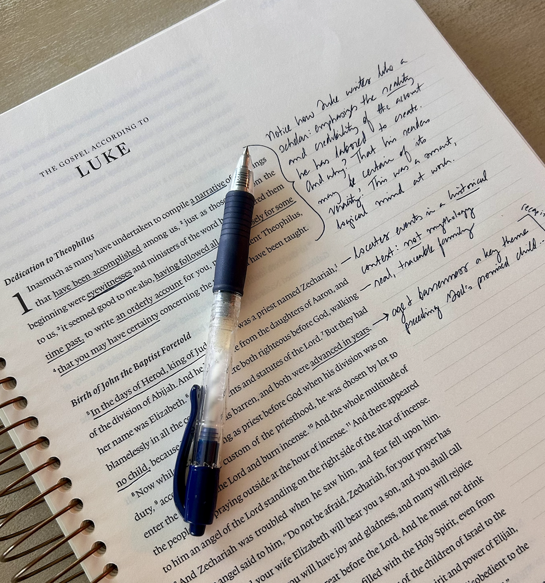 To annotate or not to annotate—that is the question that has stilted my Bible study for so long. Usually I opt for copying out passages into my journal and jotting down my thoughts, prayers, and questions that way. This is an excellent practice; transcribing Scripture in our own handwriting is a transformative discipline. But there is also something to be said for writing directly alongside the printed text.